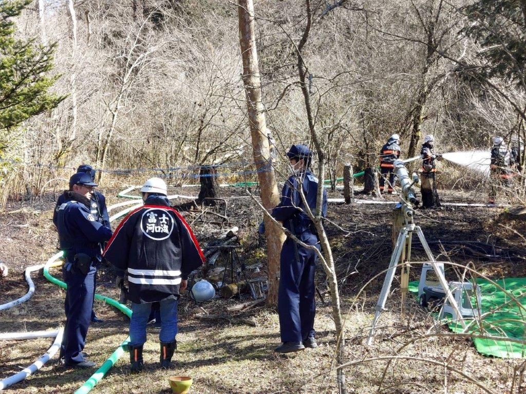当該別荘地内のボヤは たまたま散策中の村民の方の機転で発見が早かったので、FDKの初期消火で周辺の延焼を免れ火も一端速やかに消すことができました。同時に河口湖消防にも連絡し、消防・警察での対応、そして完全鎮火を確認しました。