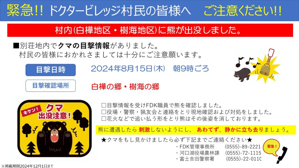ドクタービレッジ村内で熊が目撃されました。ご注意ください。(2024年8月15日 am9時頃)