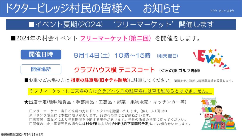 2024年村会イベントとして昨年好評だった「フリーマーケット」を今年も開催いたします。